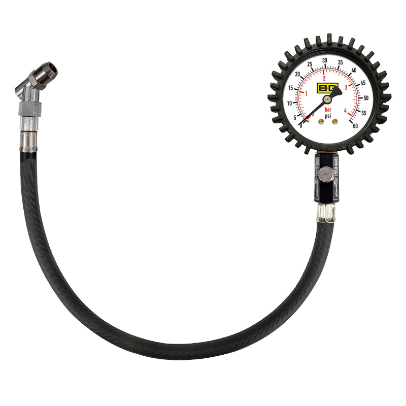 The B-G Racing 2.5” Tyre Pressure Gauge handle is CNC machined from aluminium and fitted with a flexible 457mm / 18” length black hose is fitted with a ball foot chuck for easy attachment to the tyre valve. A rubber bumper around the head of the gauge helps to protect the dial face from damage.