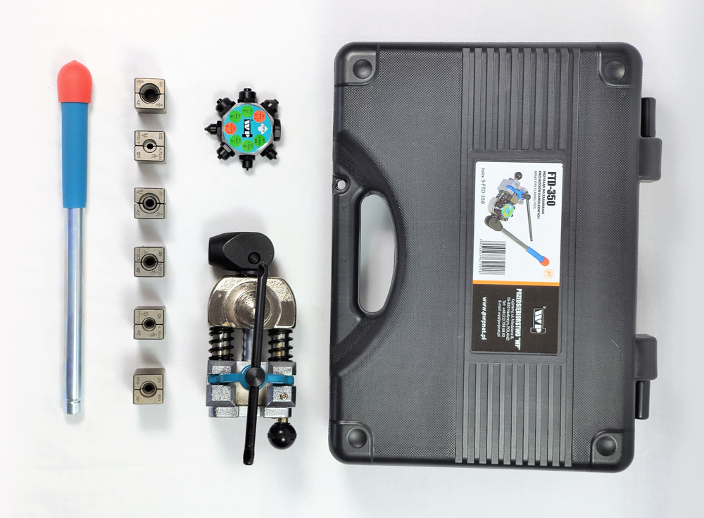 Set contains: box, user’s manual, flaring tool, clamps for tube diameter 4,75 mm (3/16’’), clamps for tube diameter 6,00 mm, clamps for tube diameter 6,35 mm (1/4”), clamps for tube diameter 8,00 mm (5/16”), clamps for tube diameter 9,52 mm (3/8”), set of punches on drum – 4,75 mm (3/16’’), 6,00 mm, 6,35 mm (1/4’’), 8,00 mm (5/16”), 9,52 mm (3/8”). Ask for spare parts.